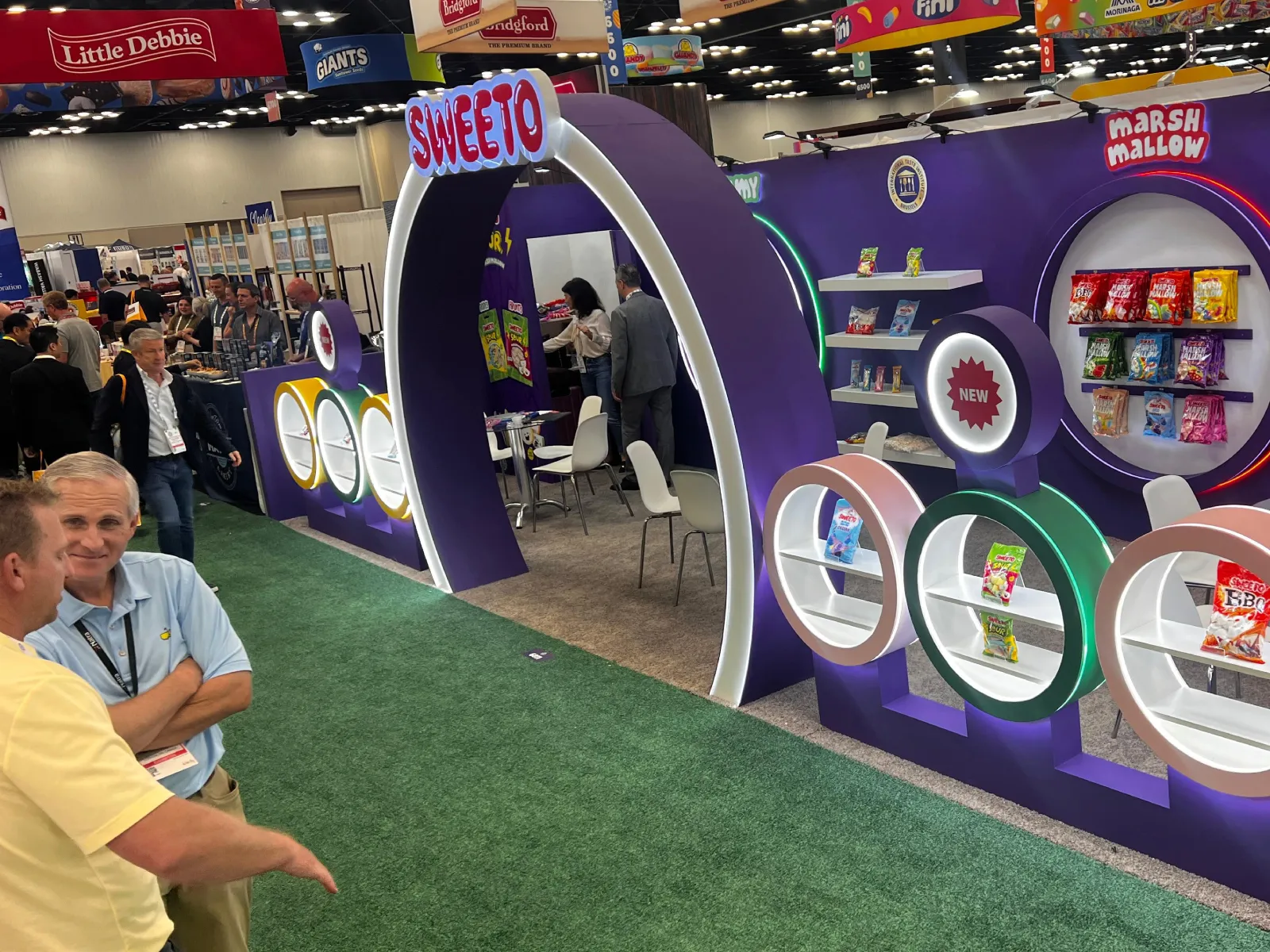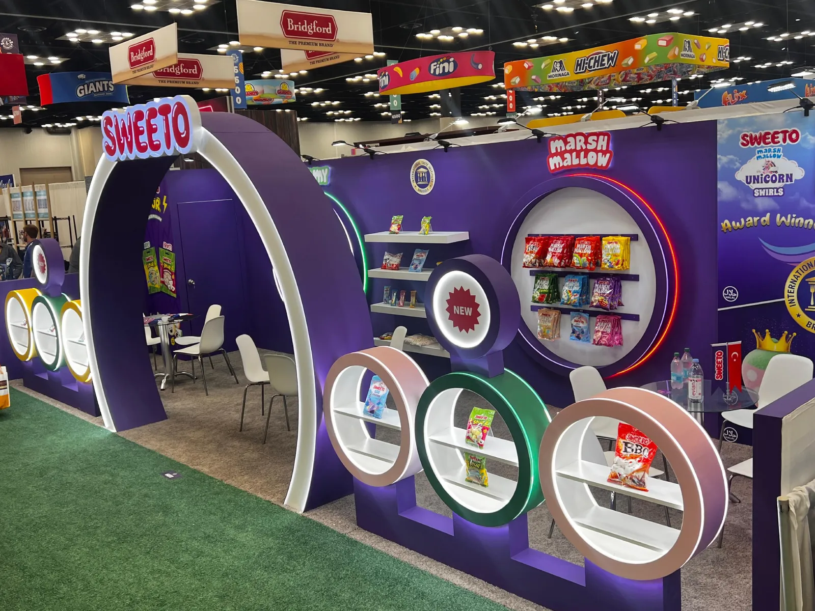 The design concept focused on creating a visually distinctive stand through bold geometry, curved architectural forms and illuminated circular display elements. These design features were developed to attract attention from multiple aisles while reinforcing SWEETO’s energetic brand personality.